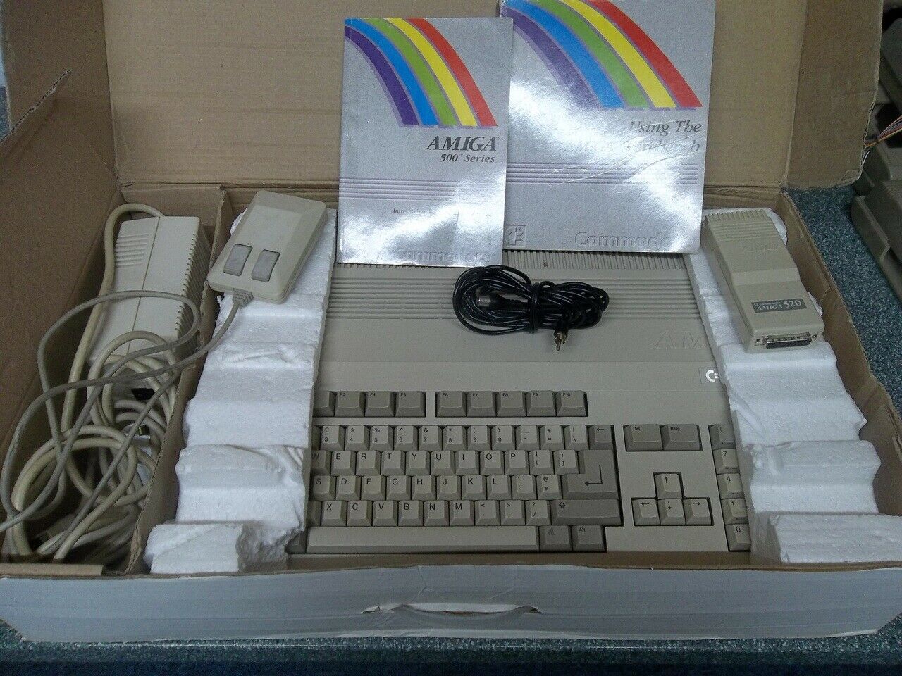 An A520 Modulator with RF lead and “Y” Audio Lead included – but for optimal picture Quality it is recommended to buy an Amiga->SCART lead.