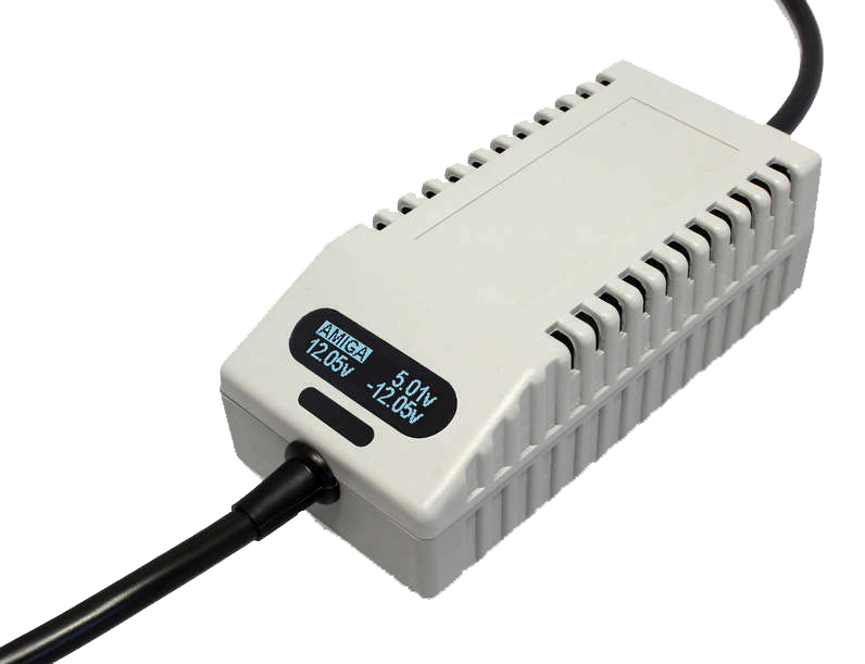 Stabilized +5V/4.0A, +12V/2.0A, and -12V/0.5A DC ensure continued error-free operation of your Amiga. Robust and sturdy chassis with an OLED digital display, touch sensor, and different styles and colors to chose from. Fully fused and electrically protected, with square DIN5 plug matching the original Amiga PSU pinout.
